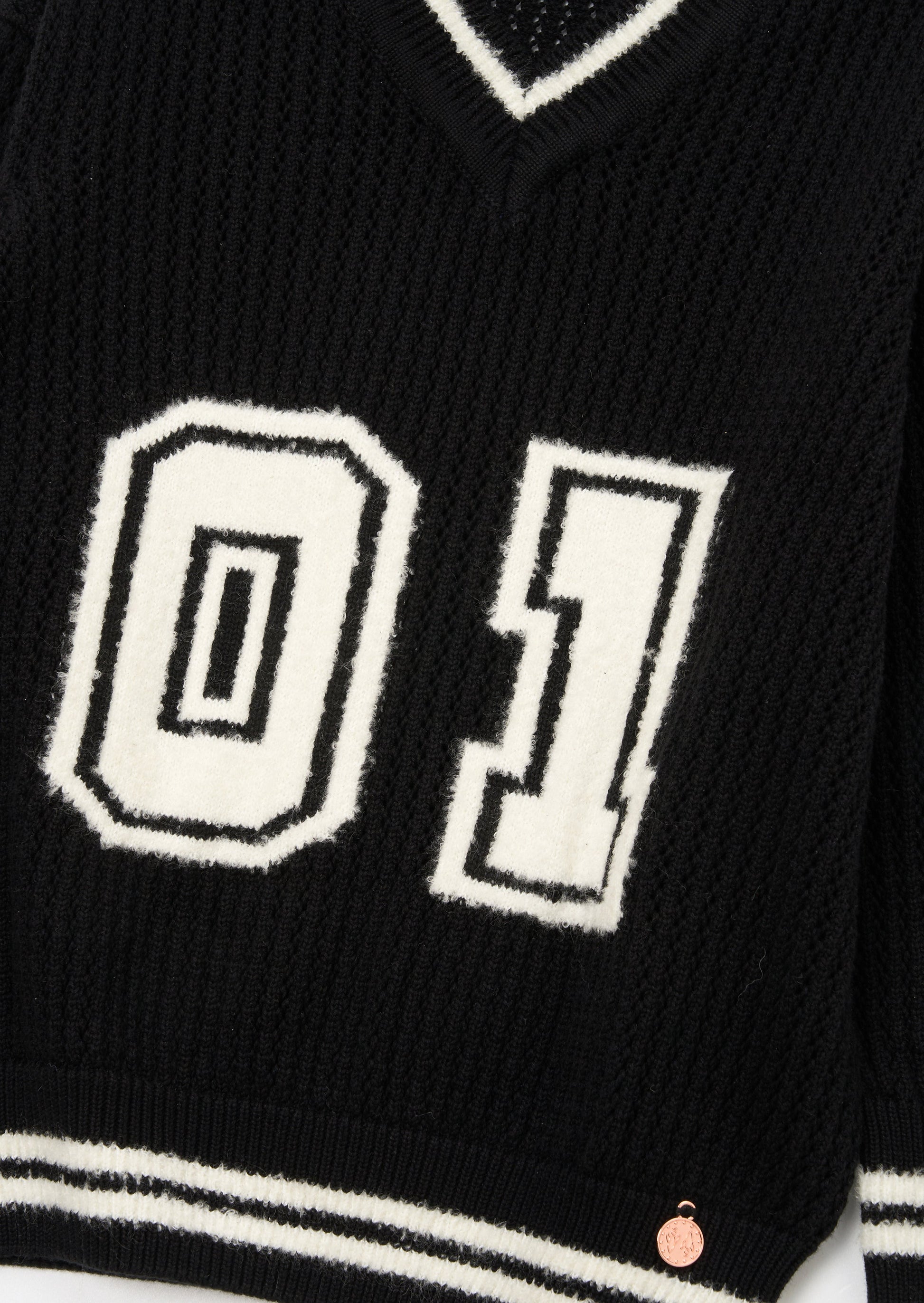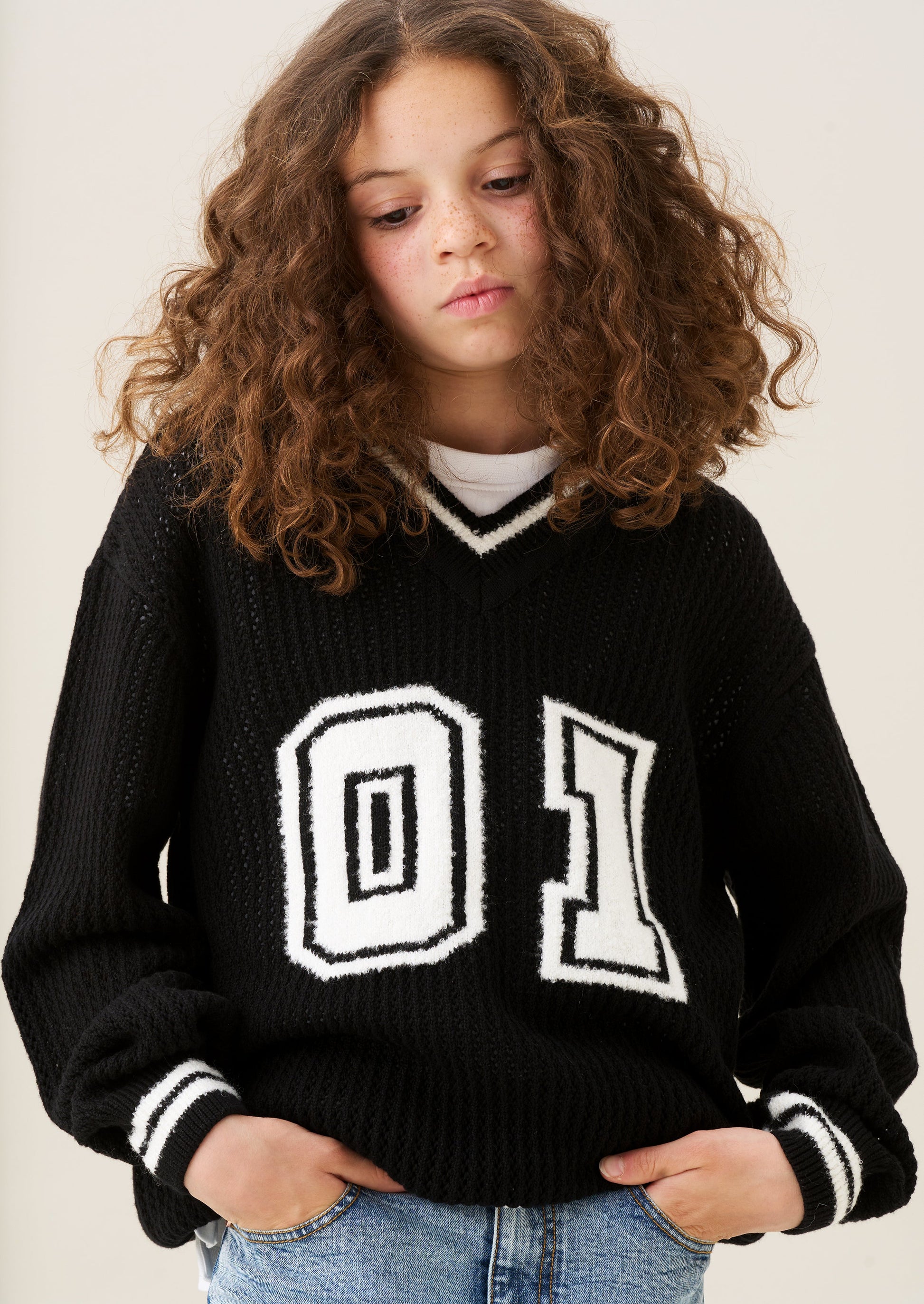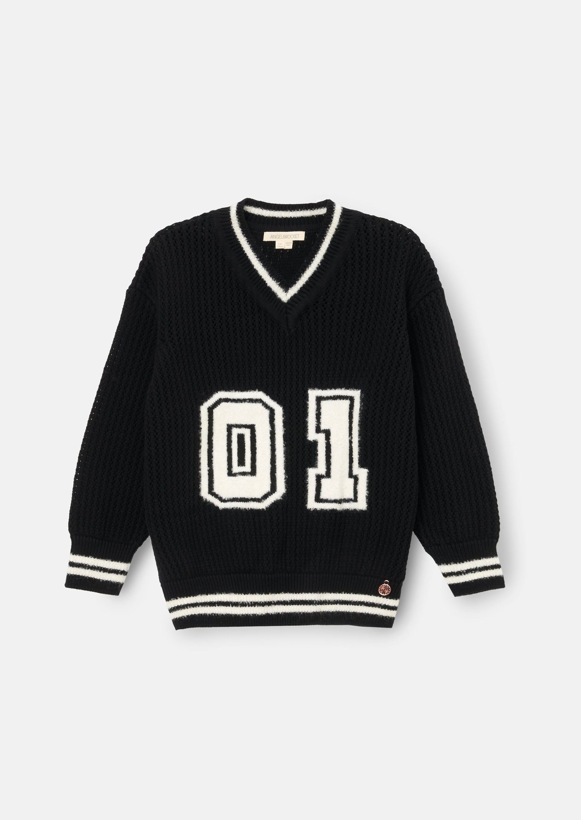 She's number one! This varsity-style jumper features a unique stitch design with a loose knit and slouchy fit. Perfect for layering, it will add effortless cool to your wardrobe.