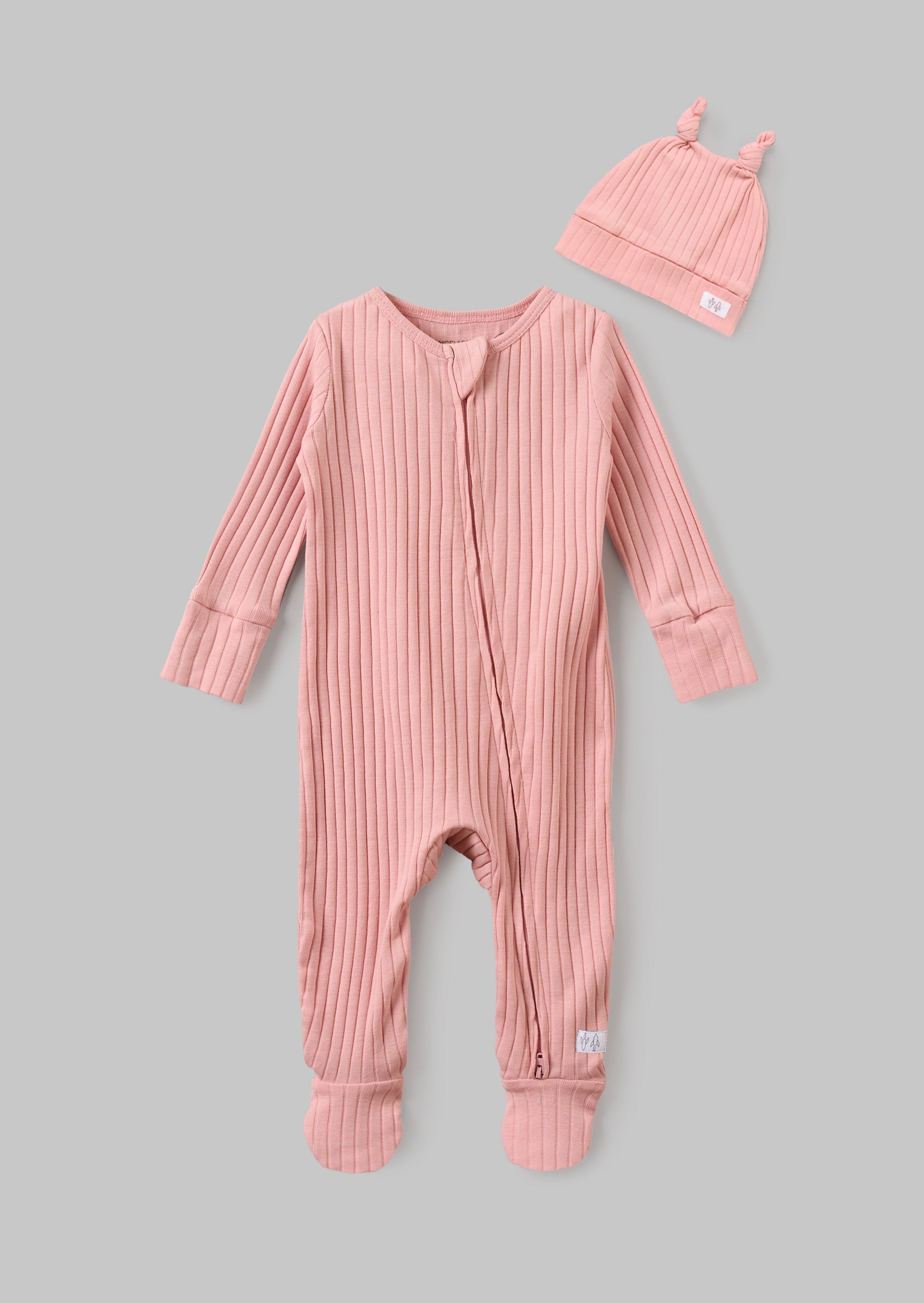 Wrap your little one in the softness of our pink rib baby grow, made from the gentlest organic cotton for ultimate comfort. Featuring a practical zip fastening, fold-back mitts, lined feet, and no scratchy neck label, it's designed with both baby and parents in mind. A sweet knotted hat completes the adorable look, perfect for snuggles. Plus, it comes with a matching fabric bag - ideal for gifting! Organic cotton is grown without harmful chemicals, supporting healthier and more sustainable farming practices.