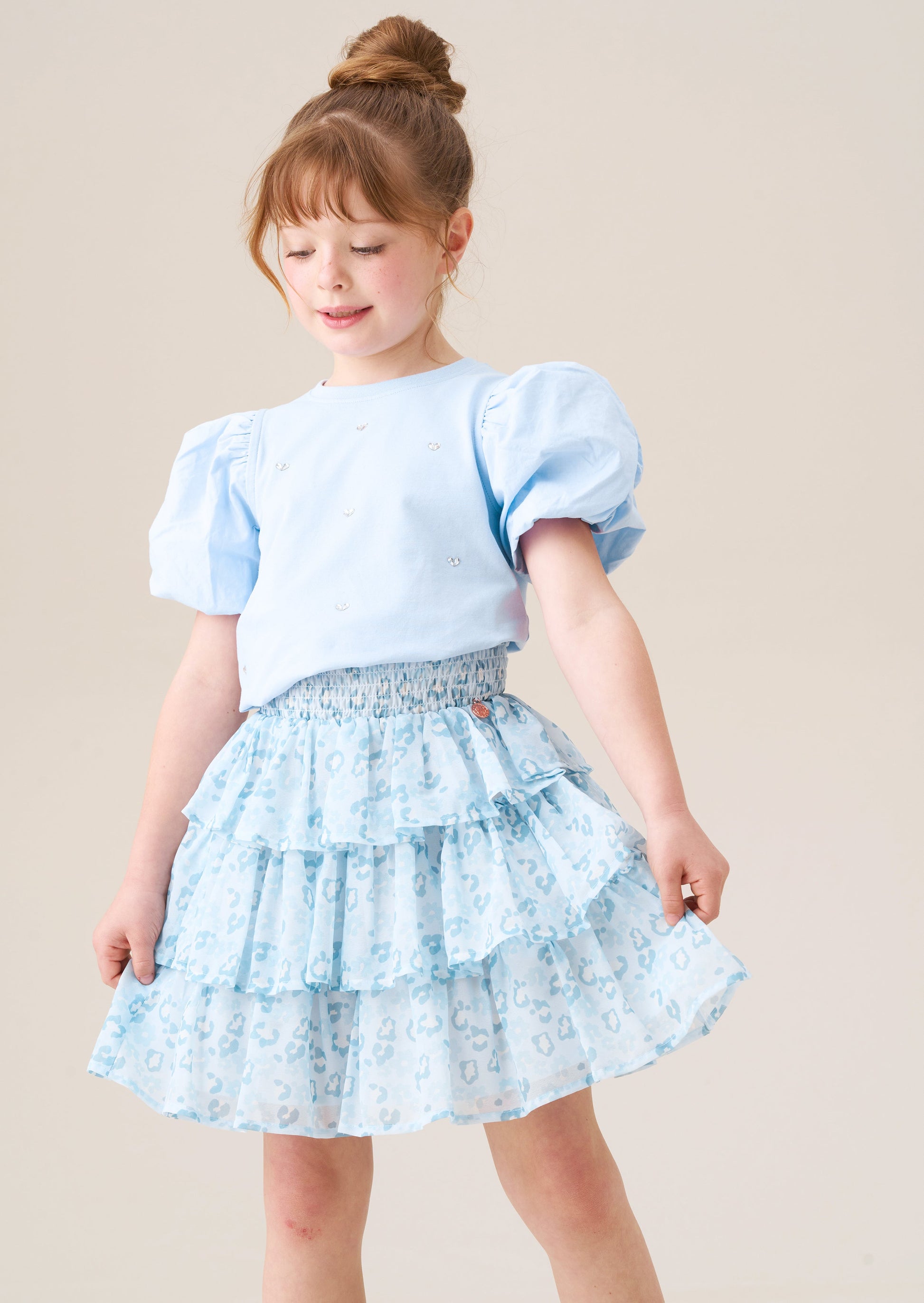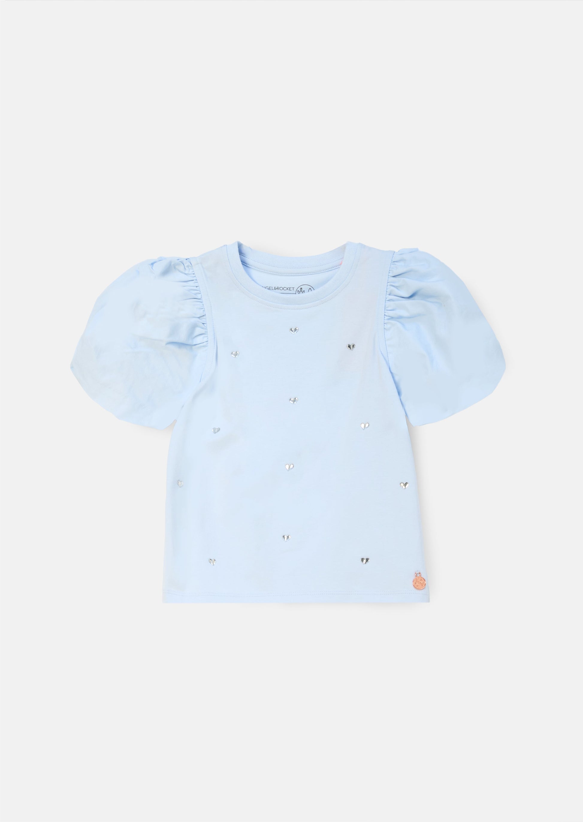 For the girl who wants to shine! Introducing our new super soft jersey tee with woven blouson sleeve, scattered with diamantes in a scrumptious blue hue.