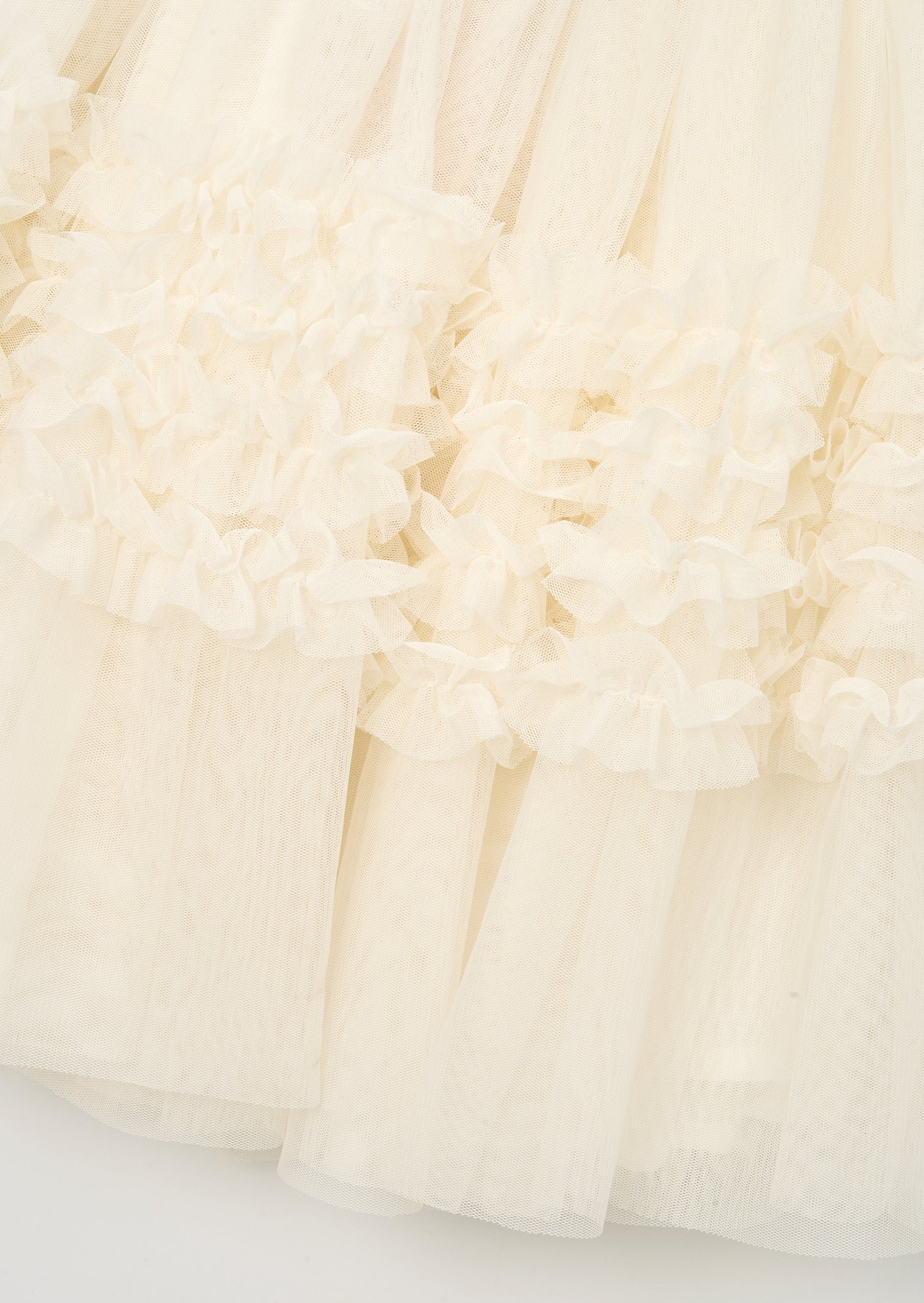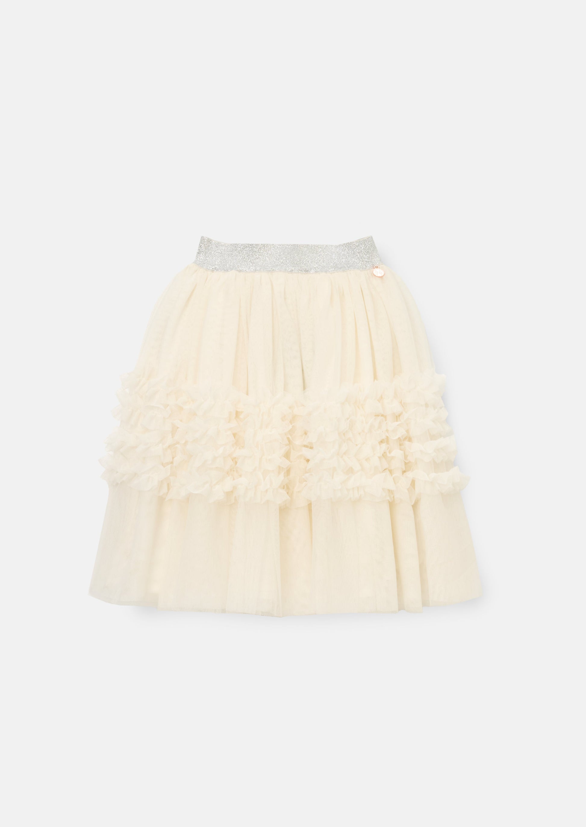 Girls, add edge to your new season wardrobe with our ivory mesh skirt! Brimming with ruffles and volume, it's the perfect skirt for twirling and the stretchy metallic waistband will ensure a comfy fit that grows with her. The ultimate party skirt!