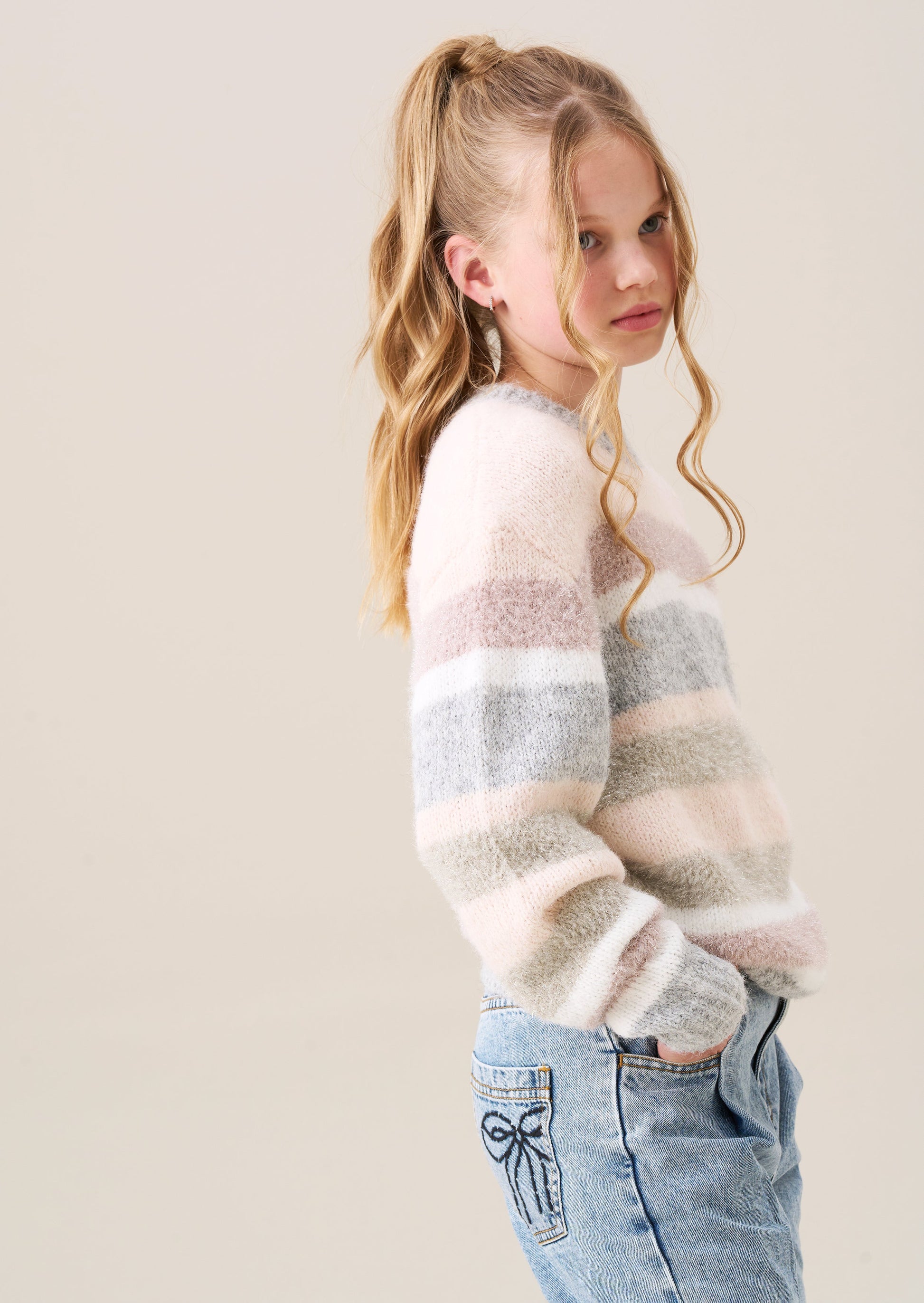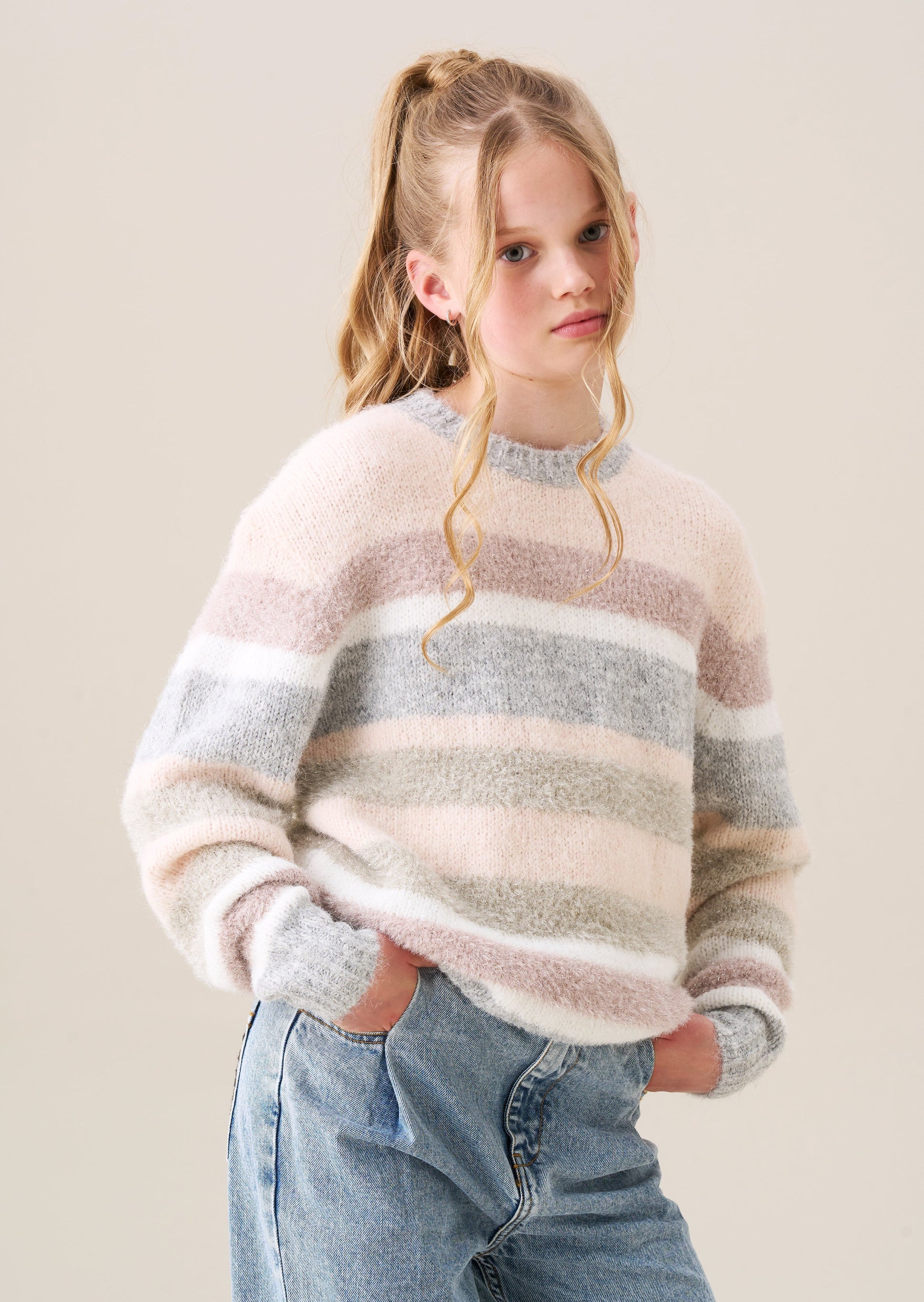 Colder weather calls for a cosy jumper! Super soft yarns in pastel stripes punctuated with a hint of metallic sparkle for extra scrumptiousness. You will never want to take it off.