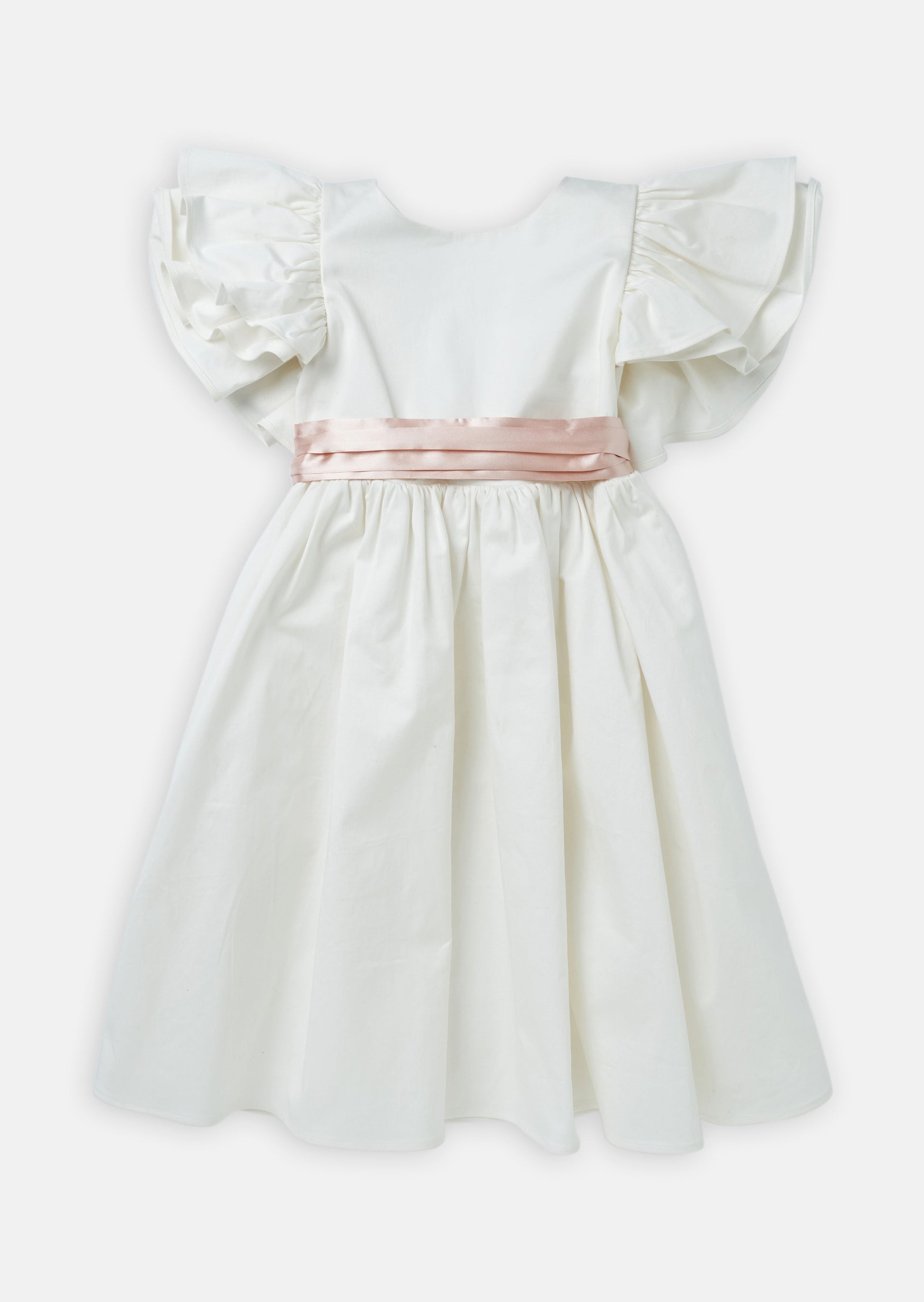 This beautiful cotton sateen ruffle dress in classic ivory with a soft pink sash is the perfect bridesmaid or flower girl choice. The stunning cotton sateen fabric ensures structure and volume, and the statement sleeve is simply exquisite.