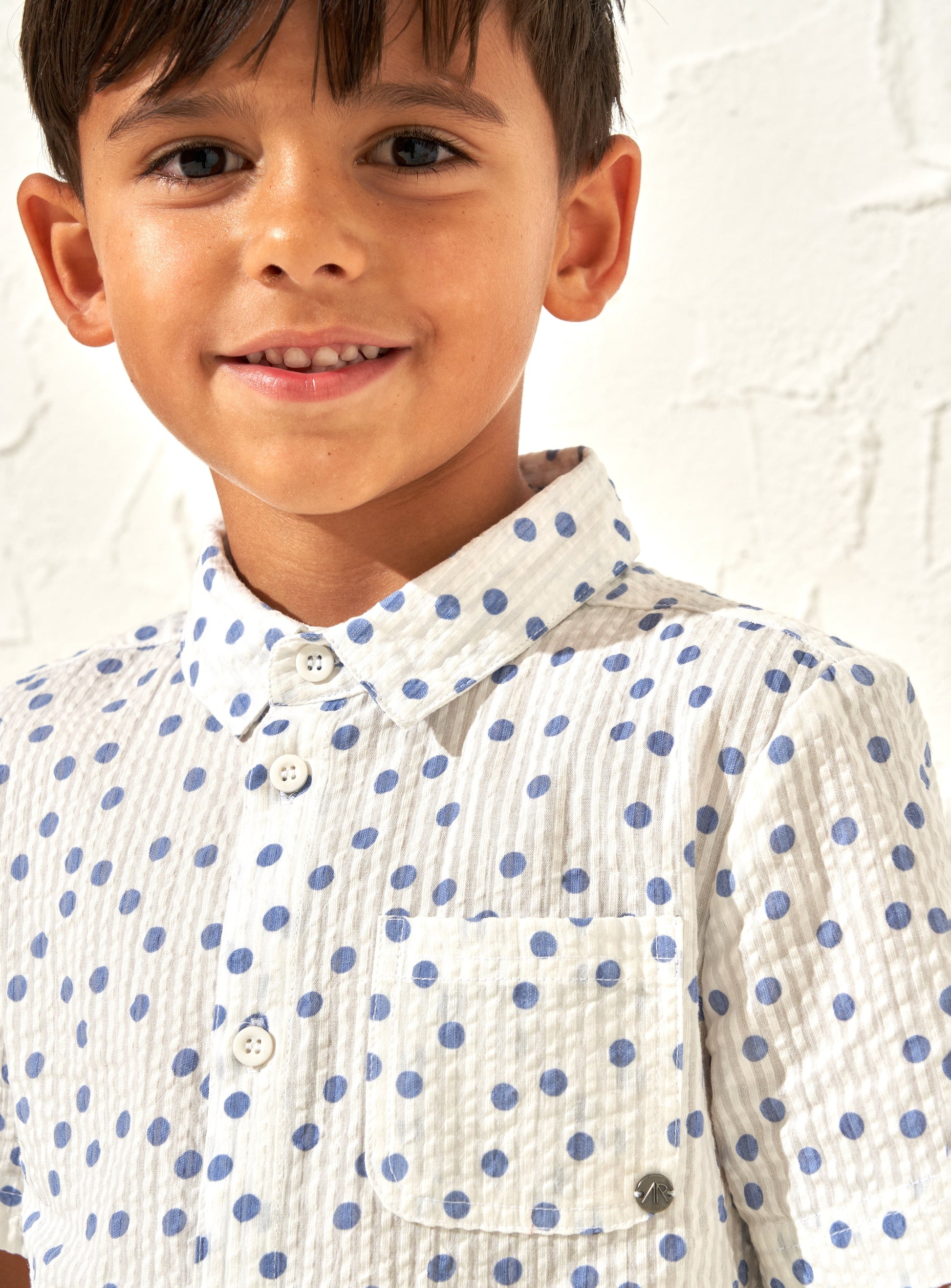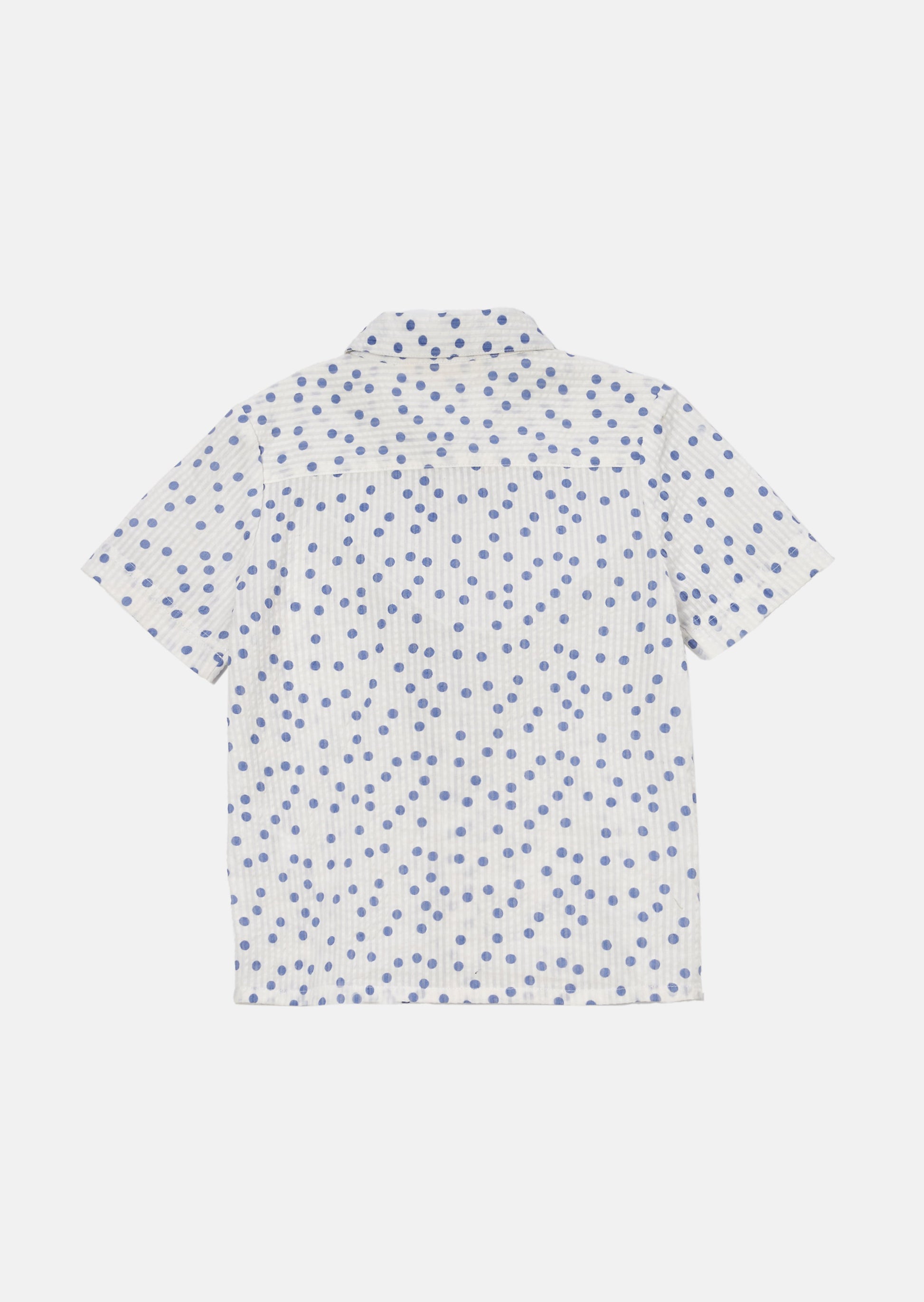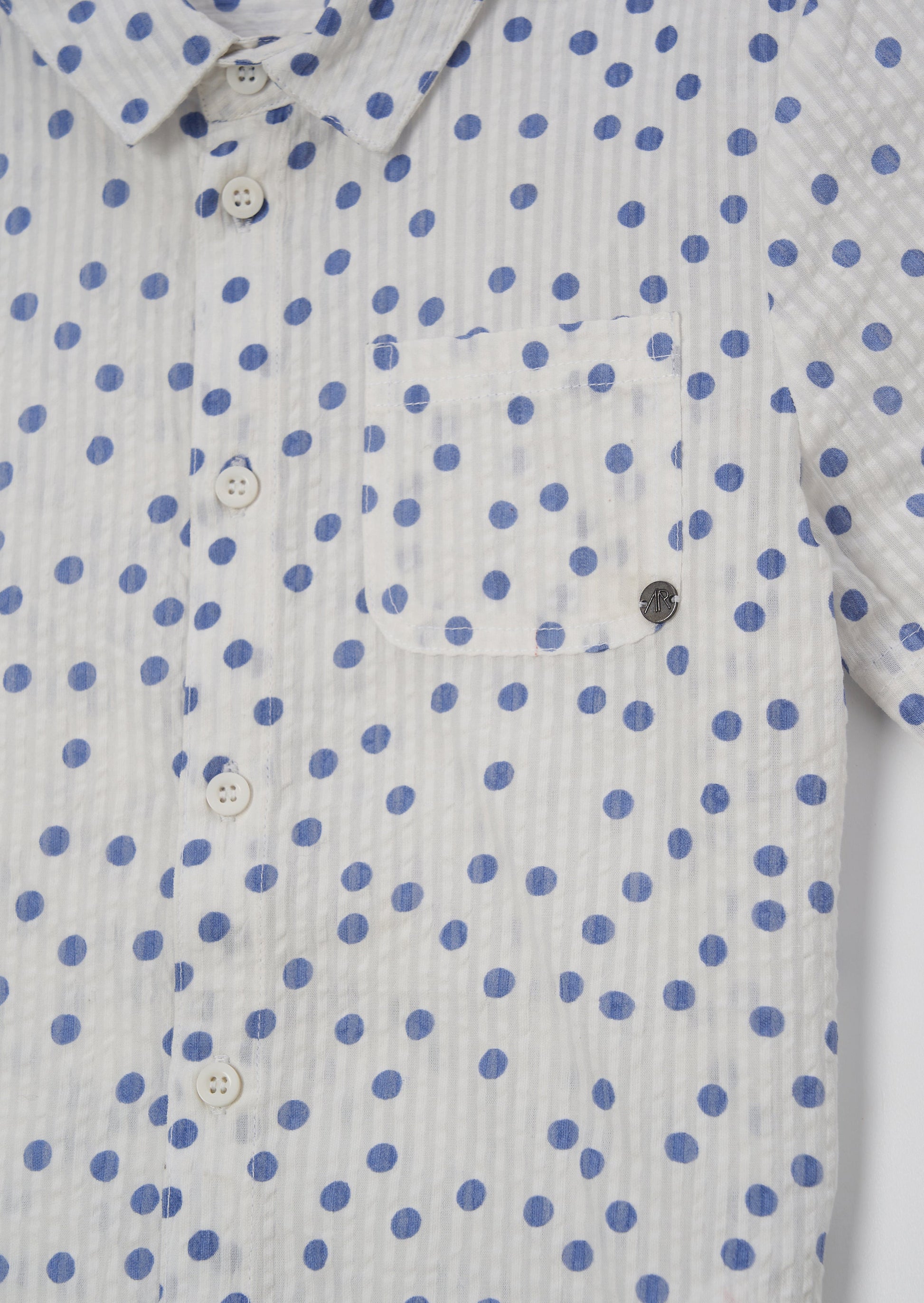 You'll go dotty for our new shirt. Crafted from textured cotton with a pale blue spot print featuring a button down placket and patch pocket. Can be paired with the matching girls shirt for couple outfit goals!