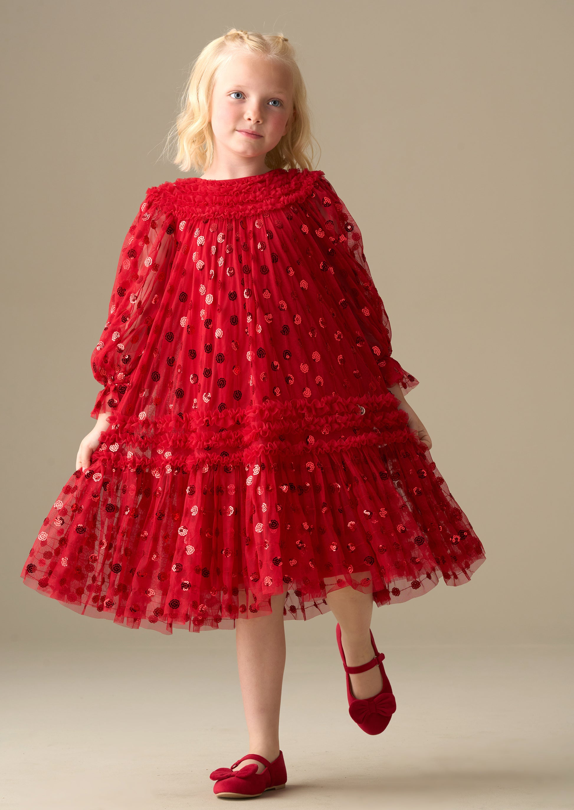 Turn up the festive sparkle in our show-stopping red dress, perfect for parties and twirl-filled celebrations. With layers of soft mesh, delicate ruffle detailing and a scattering of shimmering sequins, it's made for magical moments and standout style!