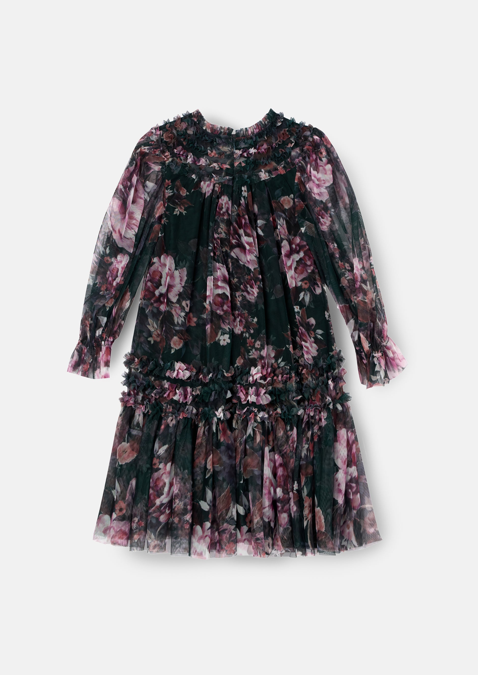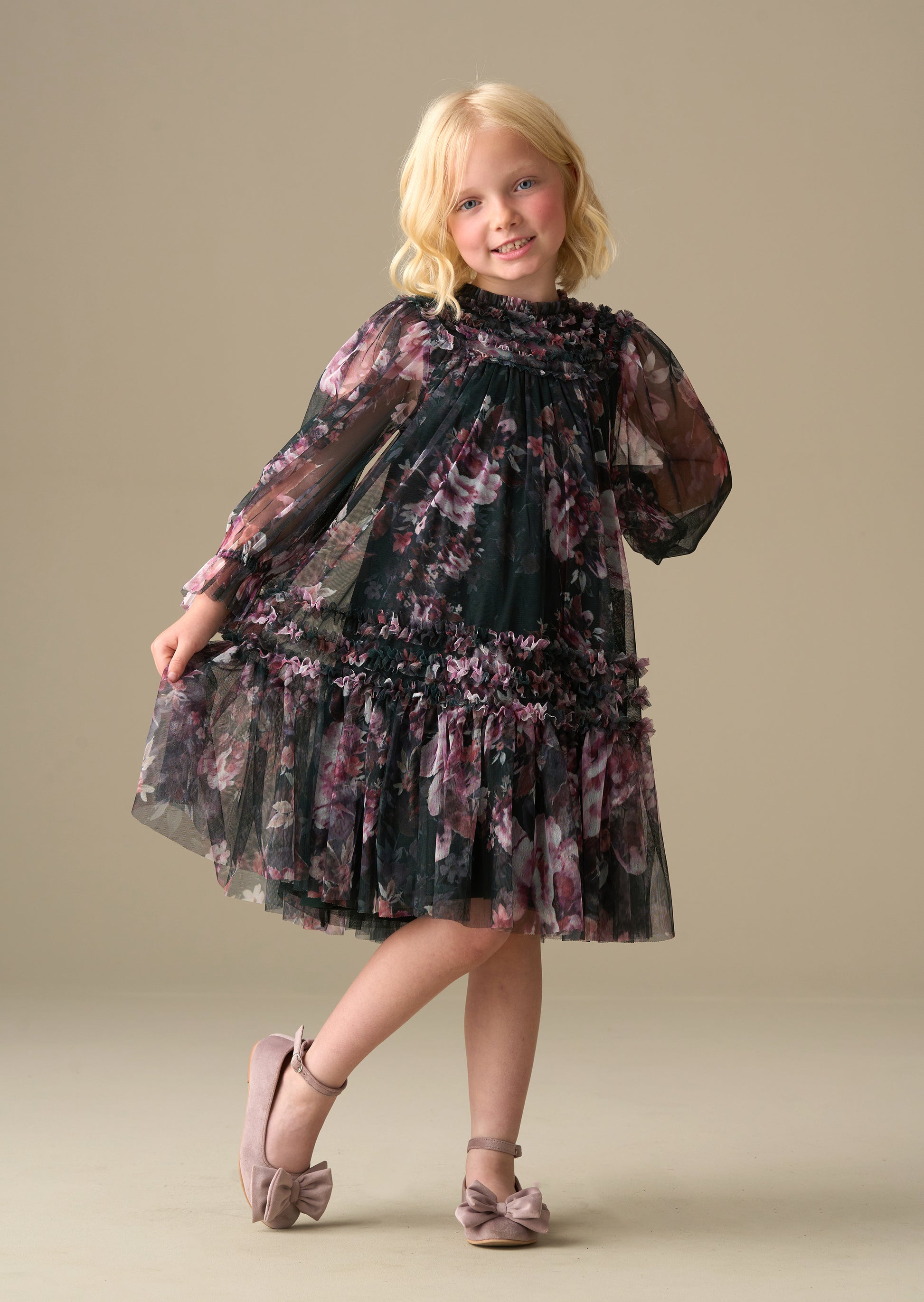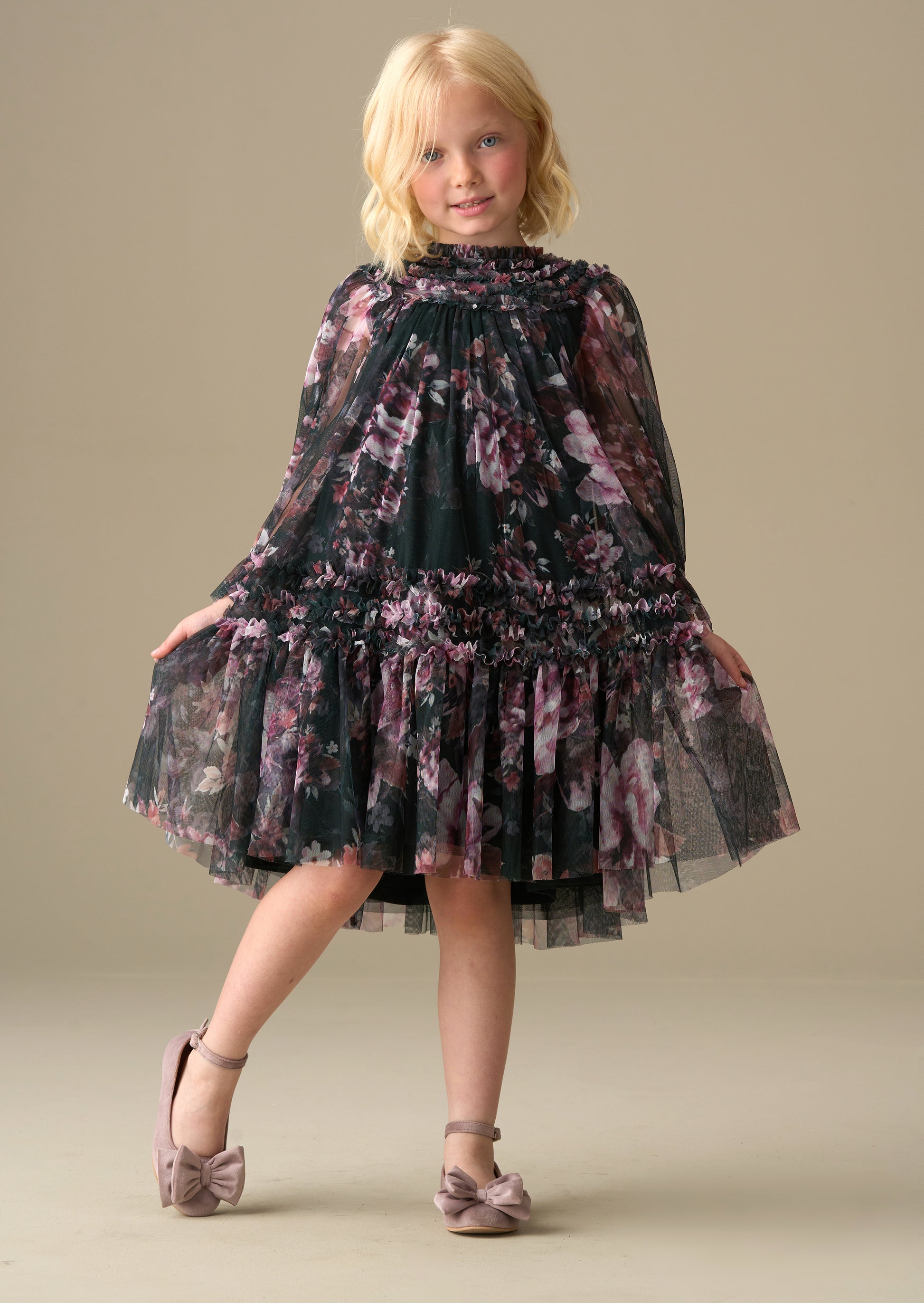 Wrapped in a rich deep green hue with a soft all-over floral print, our dreamy Verity dress is perfect for dressing up during the holiday season. Delicate mesh ruffles and floaty sleeves add extra charm, making it a beautiful choice for gatherings, family photos, and all the special moments in between.