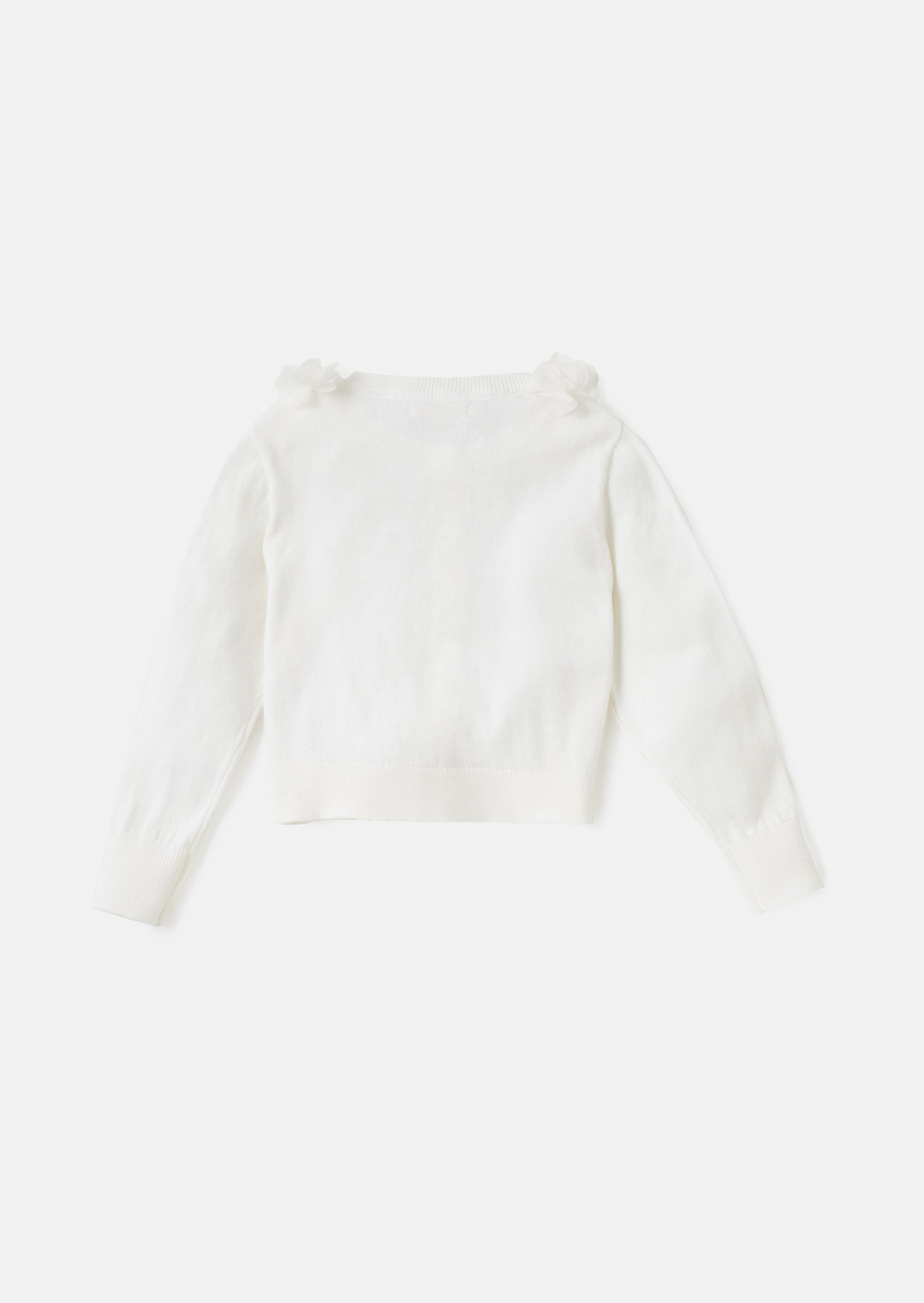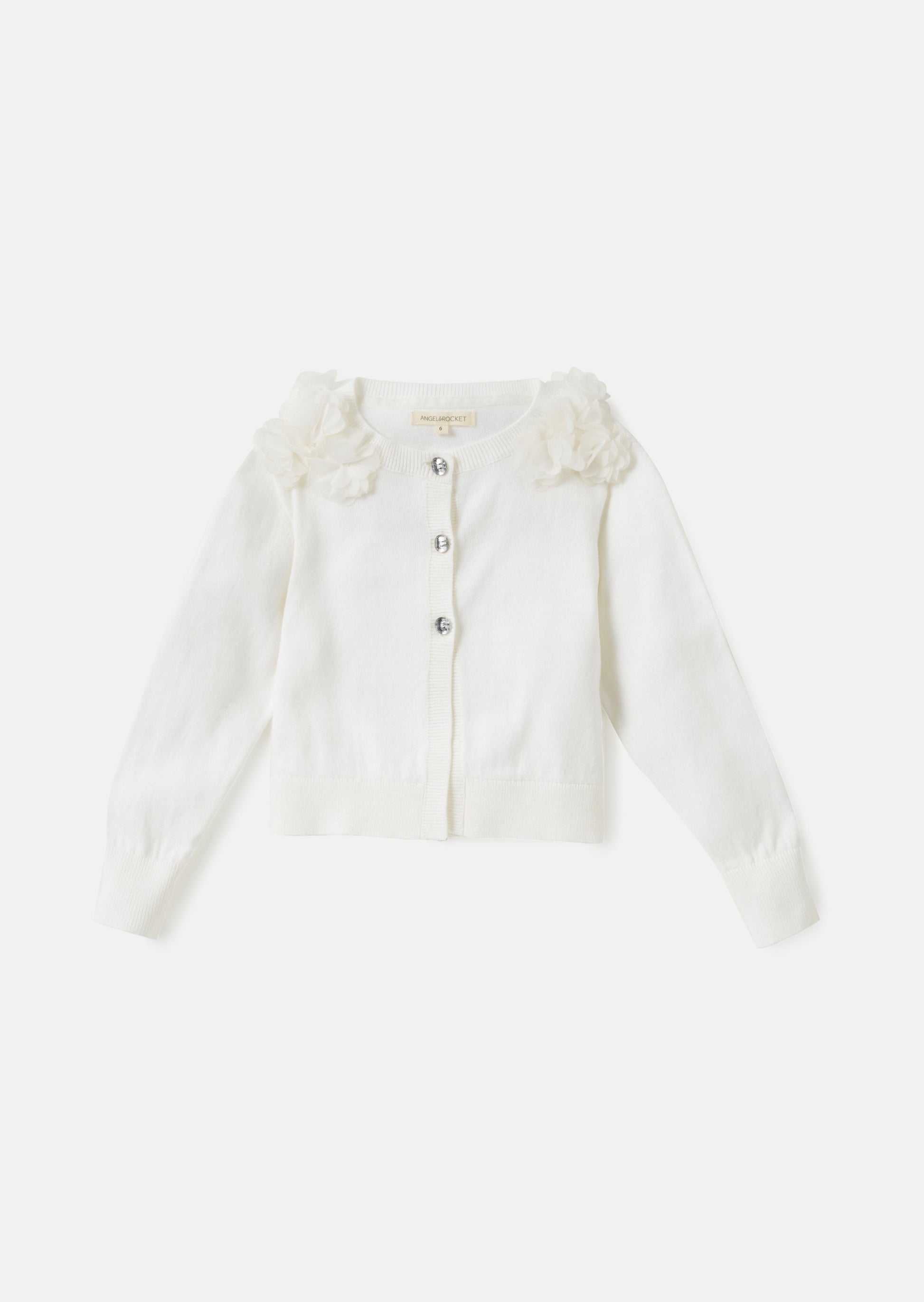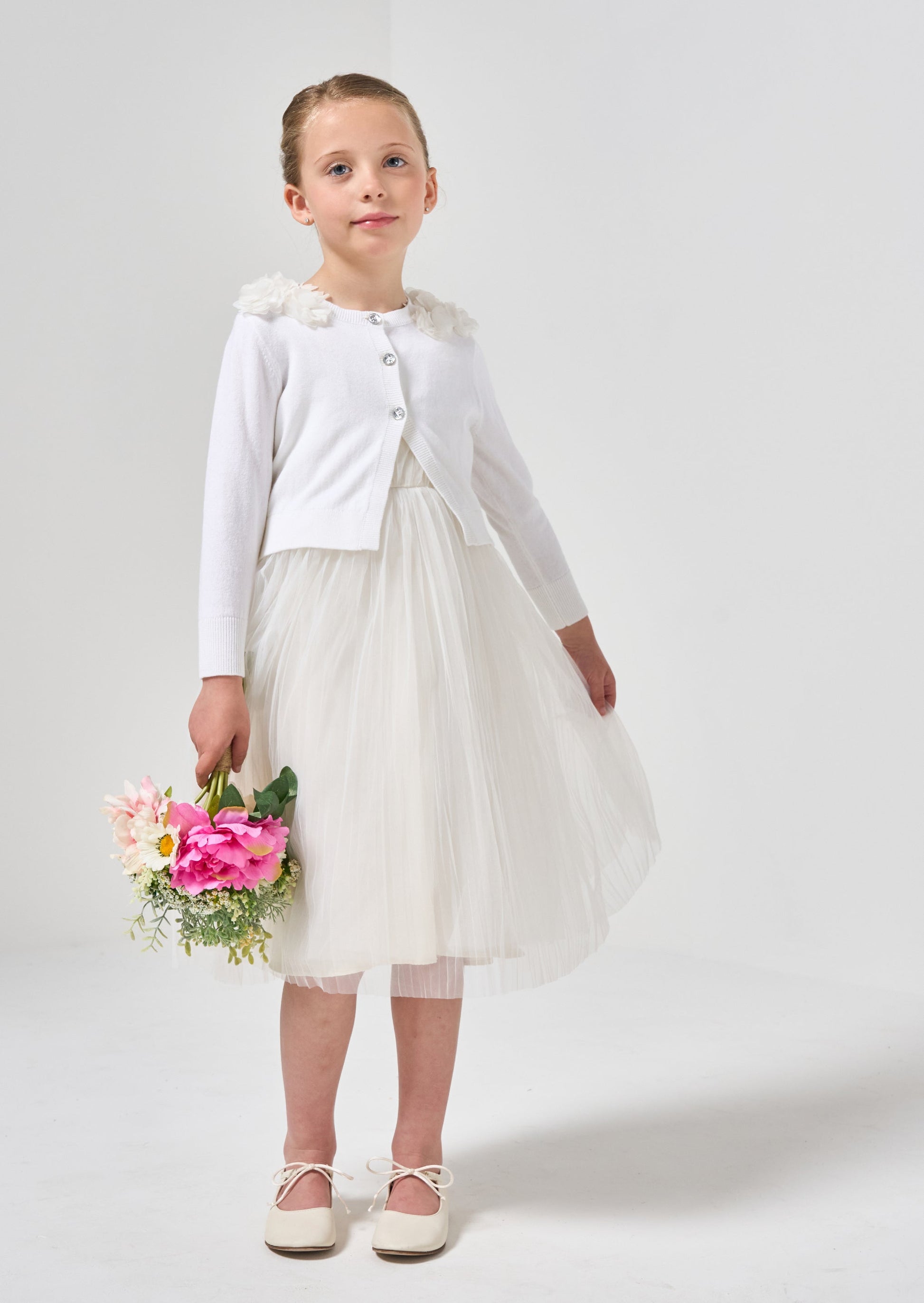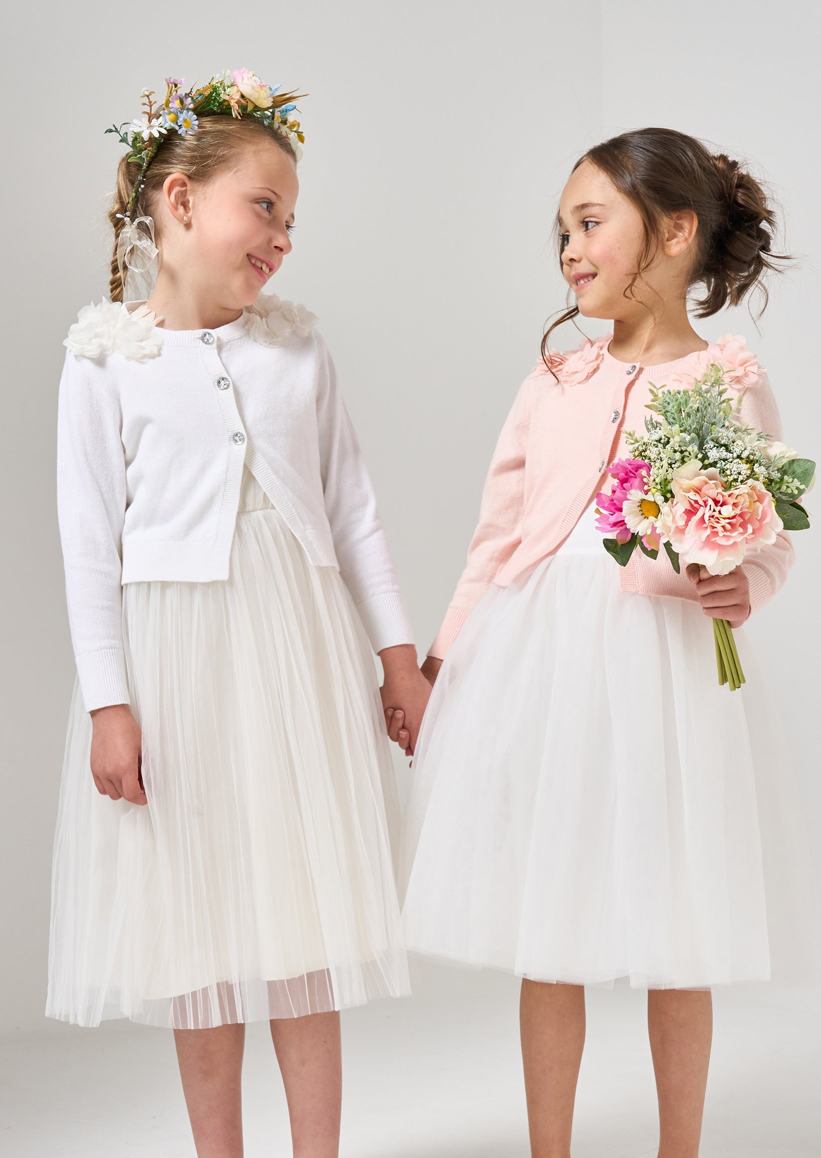 The perfect occasion wear cover up. A super soft cotton knit with delicate mesh flower detail scattered around the neckline and the prettiest diamante buttons. Model wears 5-6yrs, she is 6 years old and 116cm tall.
